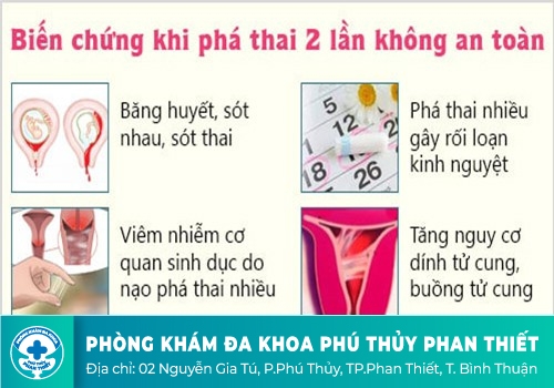 Phá thai lần 2 có thể dẫn đến chảy máu bất thường, bị băng huyết. Rồi dẫn đến xuất huyết và đau bụng dữ dội. Một số trường hợp phá thai lần 2 không thành công có thể làm thai chết lưu trong tử cung. Tạo điều kiện thuận lợi cho các vi khuẩn sinh sôi gây bệnh.